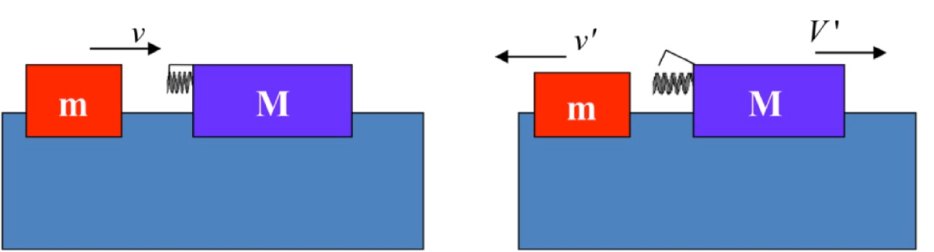 Two gliders are set up to collide on an air track as shown in the figure below. The glider on the right is at rest and has a spring connected to it. Before the collision, as shown in the figure at the left, the smaller glider (mass m) is on the left approaching the larger glider (mass M). The spring on the larger glider is compressed and stores a spring potential energy of ΔE. When the two carts collide, the spring is released, giving all its potential energy up to the kinetic energy of the two carts. (The mass of the spring and latch is included in M; the friction internal to the spring and between the carts and the air track may be ignored.)