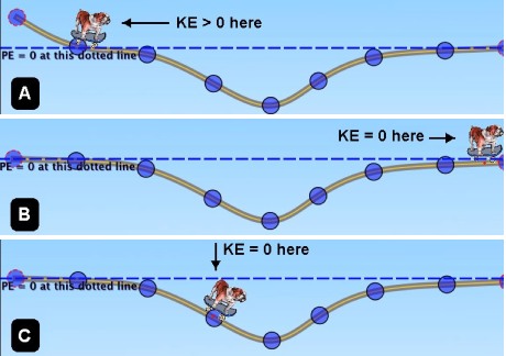 In the three figures labeled A, B, and C at the right are shown three situations in which a bulldog on a skateboard traverses a dip in the ground. (The dips are all the same.) In A, the bulldog enters the dip traveling at a non-0 kinetic energy (KE). In B, when he leaves the dip, he has 0 KE. In C, he begins in the dip (at the position indicated) at a KE of 0. Since he is riding a skateboard, friction may be ignored. | ![]() |