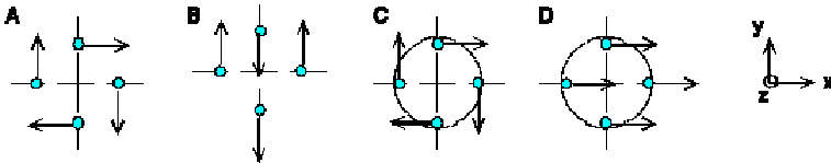 In the figure below are shown snapshots of four situations in which a set of 4 point masses are moving in various configurations. The masses are all identical and each has a mass m. Their speeds are all identical and have the value v, and each mass is a distance R from the place where the dotted lines cross (the system origin). Use the coordinate directions shown on the right but for each system take the origin to be at the indicated crossing of the dotted lines.