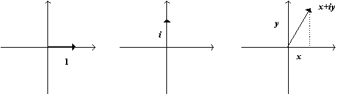 Since complex numbers correspond to two independent coordinates an x and a y we can try plotting a single complex number as a vector in a 2dimensional space. Let's just use the x part of the complex number as an xcoordinate and the y part as a y coordinate. Then we have the following pictures: the number "1" just corresponds to a vector of unit length along the positive x axis, the number "i" to a vector of unit length along the positive y axis, and a general number x+iy, to a vector from the origin to the point {x,y}.