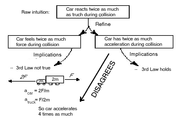 This time, most students answered correctly.  Working through follow-up questions, they concluded that their ìinstinctsî agree with Newtonís 3rd law.  Elby identified studentsí correct answer  as reflecting their "raw intuition" that ìthe car reacts twice as much during the collision," and he led them to the idea that they could "refine" this raw intuition in one of two ways, as summarized by the accompanying graphic.  The figure below represents the contents of the whiteboard at the end of a  long class discussion about these issues.