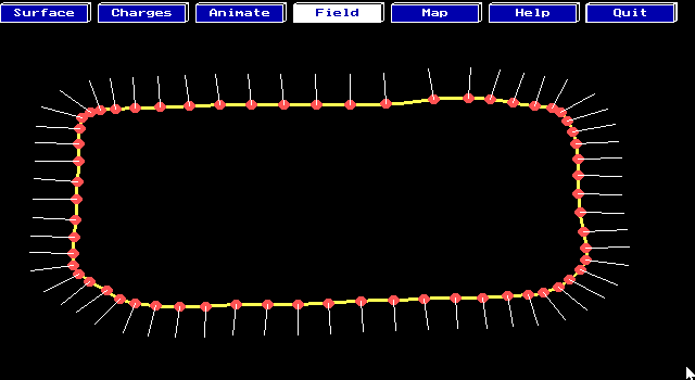 You may measure the electric field at any point by choosing FIELD and clicking at the desired point. A small short line is dropped at that point representing a field vector, its color indicating the strength of the field. The color scale is spectral with red being the strongest, followed by orange, yellow, green, blue, violet, and gray (the weakest).