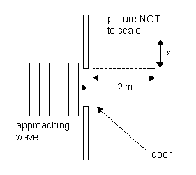 Treat these two waves as plane waves passing through a slit whose width equals the width of the door. Find the angle that gives the position of the first dark diffraction fringe. From that, assuming you are 2 m back from the door, estimate how far outside the door you could be and still detect the wave. (See the picture for a clarification. The distance x is desired.) |