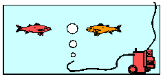 In the picture at the right is shown a sketch of two fish in an aquarium. At the instant of time shown, one of the fish is looking at the other through a bubble of air. What kind of image do you expect the fish to see? Will it appear larger or smaller than the object? Nearer or farther? Give an explanation and draw a careful ray diagram to support your argument.