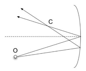 In the figure shown at the right, point O is a source of light. Two rays from O are shown reflecting from a curved mirrorand crossing each other at the point marked C. (The mirror is a part of a sphere but the curvature is not drawn to scale) On the figure, find the focus of the mirror by drawing appropriate rays. Explain why you drew the lines you did.