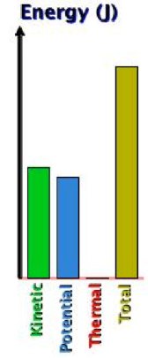 A) In the figure at the right is shown a bar graph representing the division of energies at one of the labeled points. Which point do you think it is? Justify your answer. B) In the figure below is shown a plot of the skateboarder’s various energies as a function of time. Where is he on the track at t = 0 s, 2.9 s, 5.3 s, and 6.9 s? (These times are marked by arrows below the graph.)