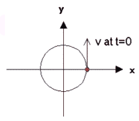Little Jay is enjoying his first ride on a merry-go-round. (He is riding a stationary horse rather than one that goes up and down.) A schematic view of the merry go-round as seen from above is shown in the drawing below the picture of the horse with a convenient coordinate system. A bit after the merry-go-round has started and is going around uniformly, we start our clock. Little Jay's position and velocity at time t = 0 is shown as a dot and arrow.