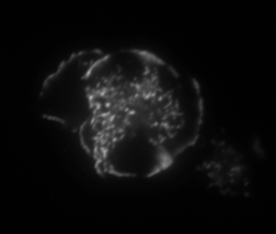QuickTime Movie: Actin-membrane waves in a spreading T cell (to view click on the image above). Jurkat T cell expressing EGFP actin spreading on anti-CD3 substrate.