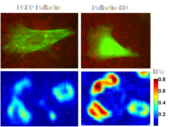 The ability of cells to sense the mechanical stiffness of their environment is critical for many aspects of cell function such as migration, wound healing and the proper formation of tissues and organs. In order to sense the mechanical properties of their environment, cells exert forces on their surroundings by reorganizing their actin cytoskeleton and generating myosin dependent contractile forces. Cells organize actin filaments into higher-order structures by regulating the composition, distribution and concentration of actin crosslinkers. Palladin is an actin-crosslinking protein which plays a key role in regulating cell morphology and movements during embryonic development and cancer. It is found in the lamellar actin network and stress fibers, two actin structures critical for force generation and sensing of the physical environment. By virtue of its close interactions with actomyosin structures in the cell, palladin may play an important role in cell mechanics.